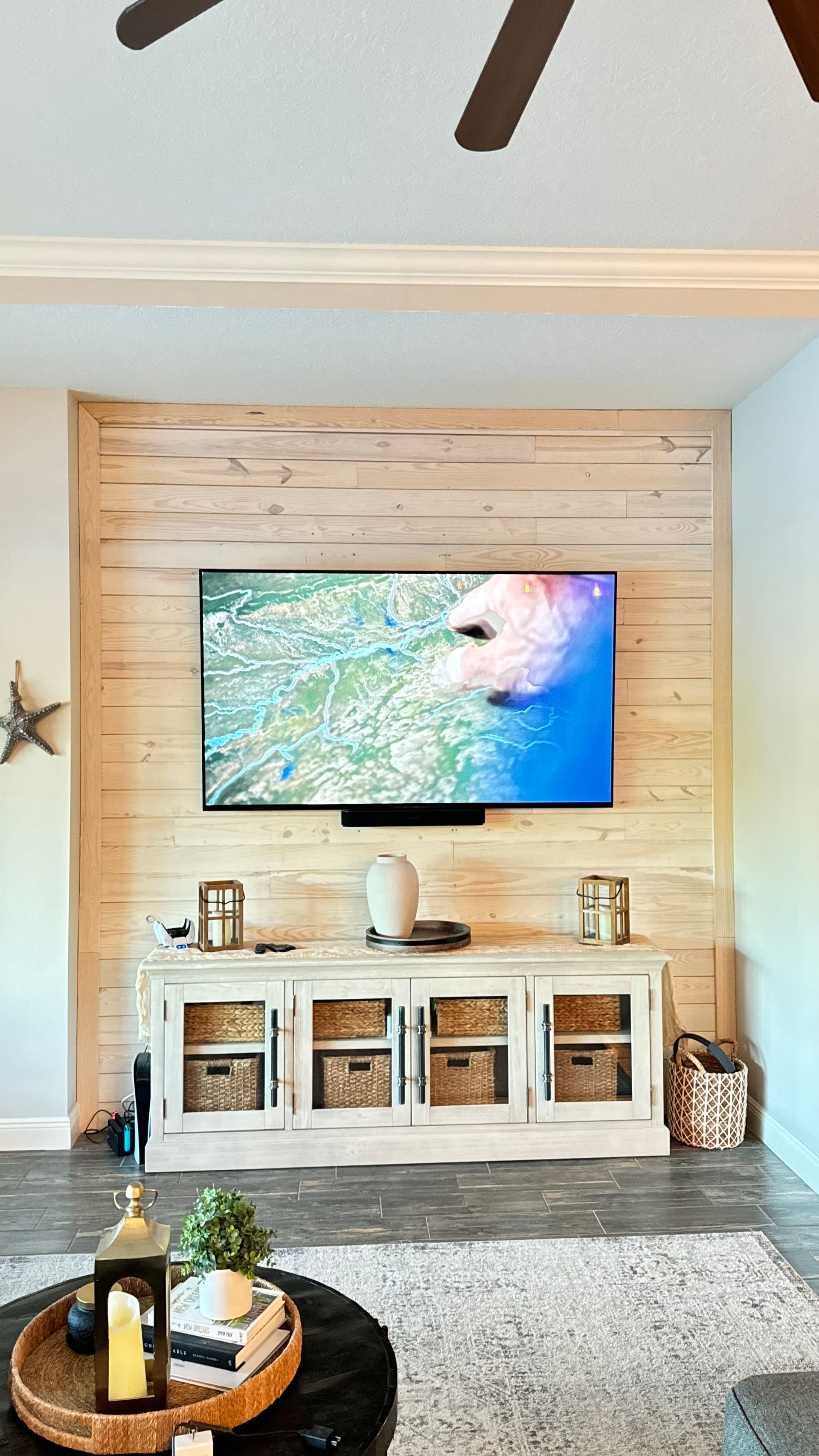 Living Room: Custom beach style wall with Sony OLED TV and Sonos surround sound