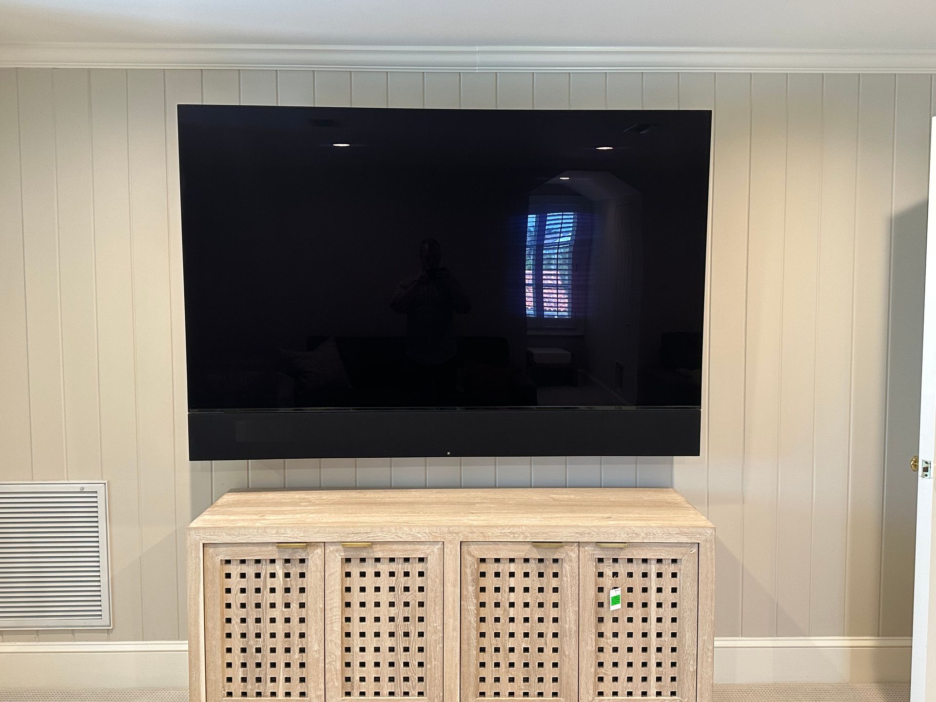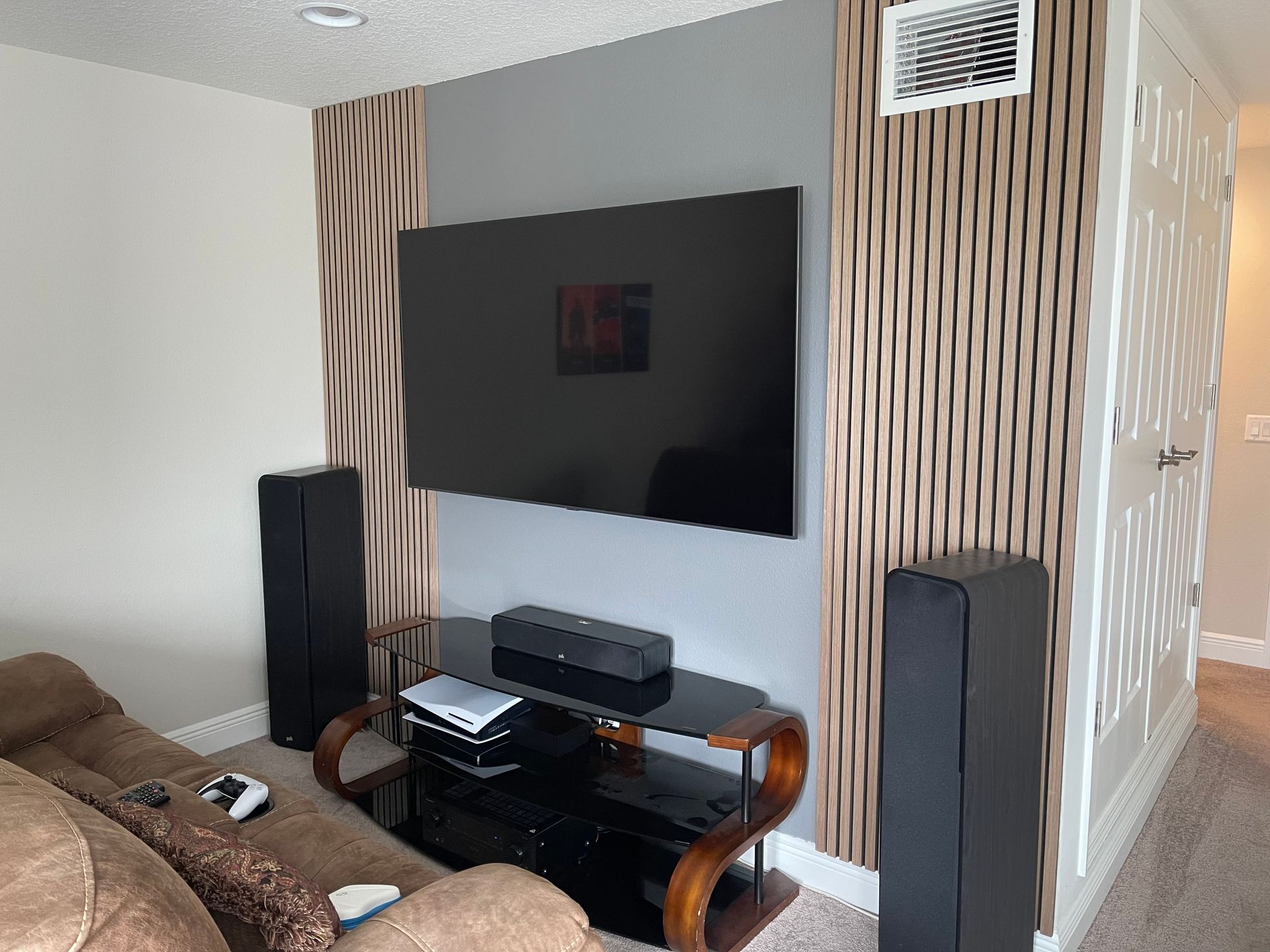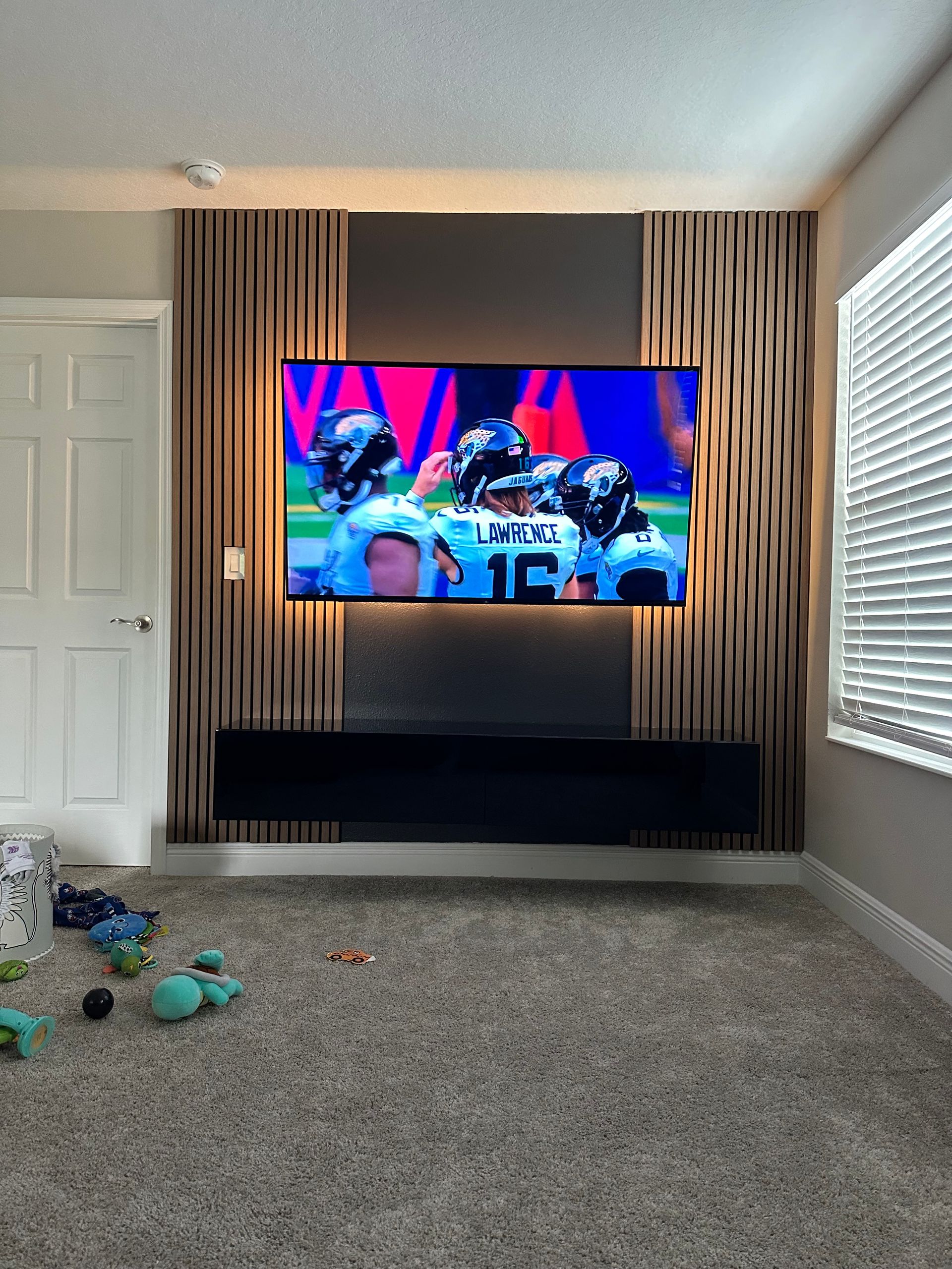 Bonus Room: Sony OLED TV, floating AV stand and custom wood paneling