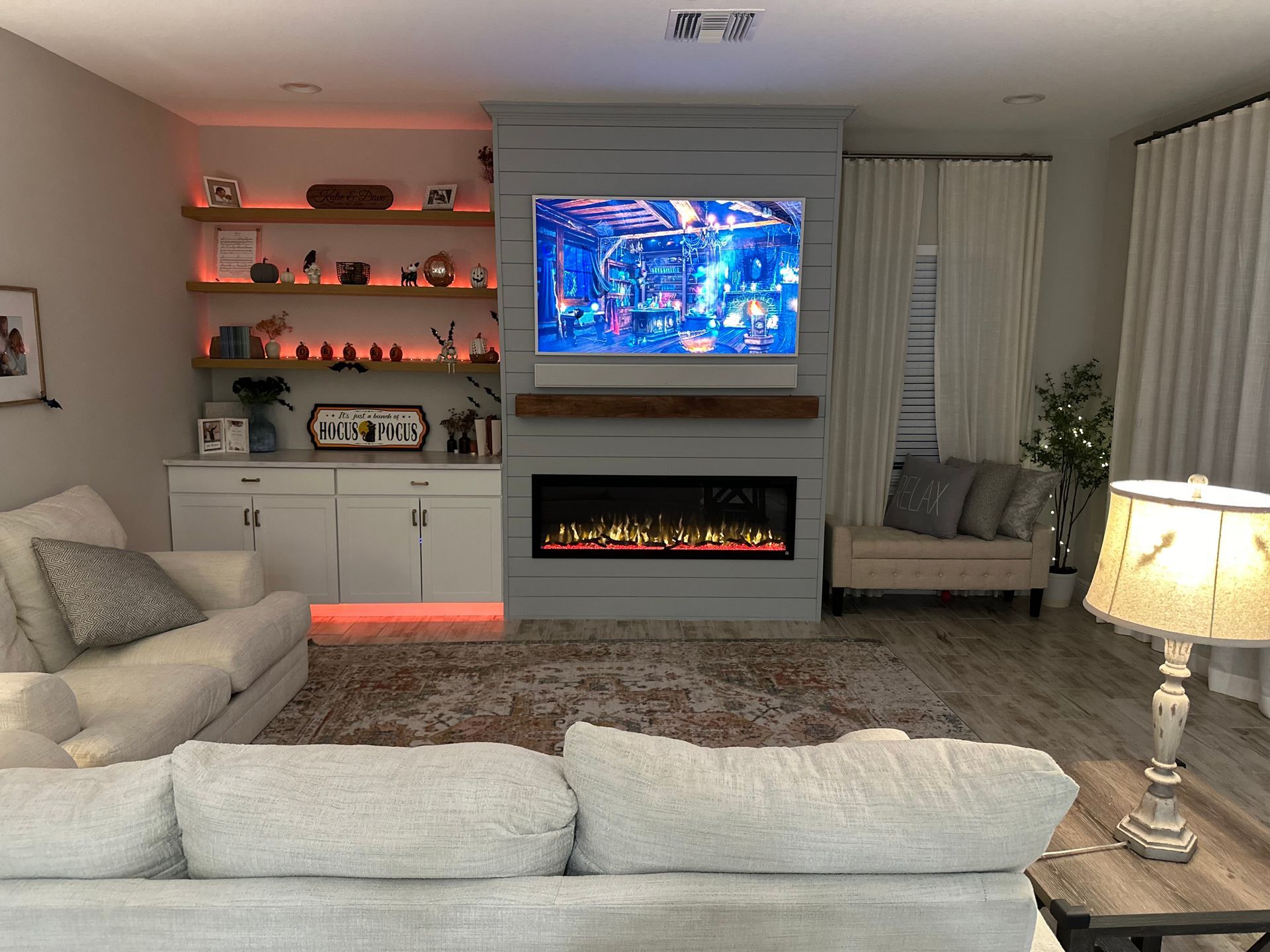 Living Room: Custom entertainment system, complete with Samsung Frame TV and matching handmade soundbar
