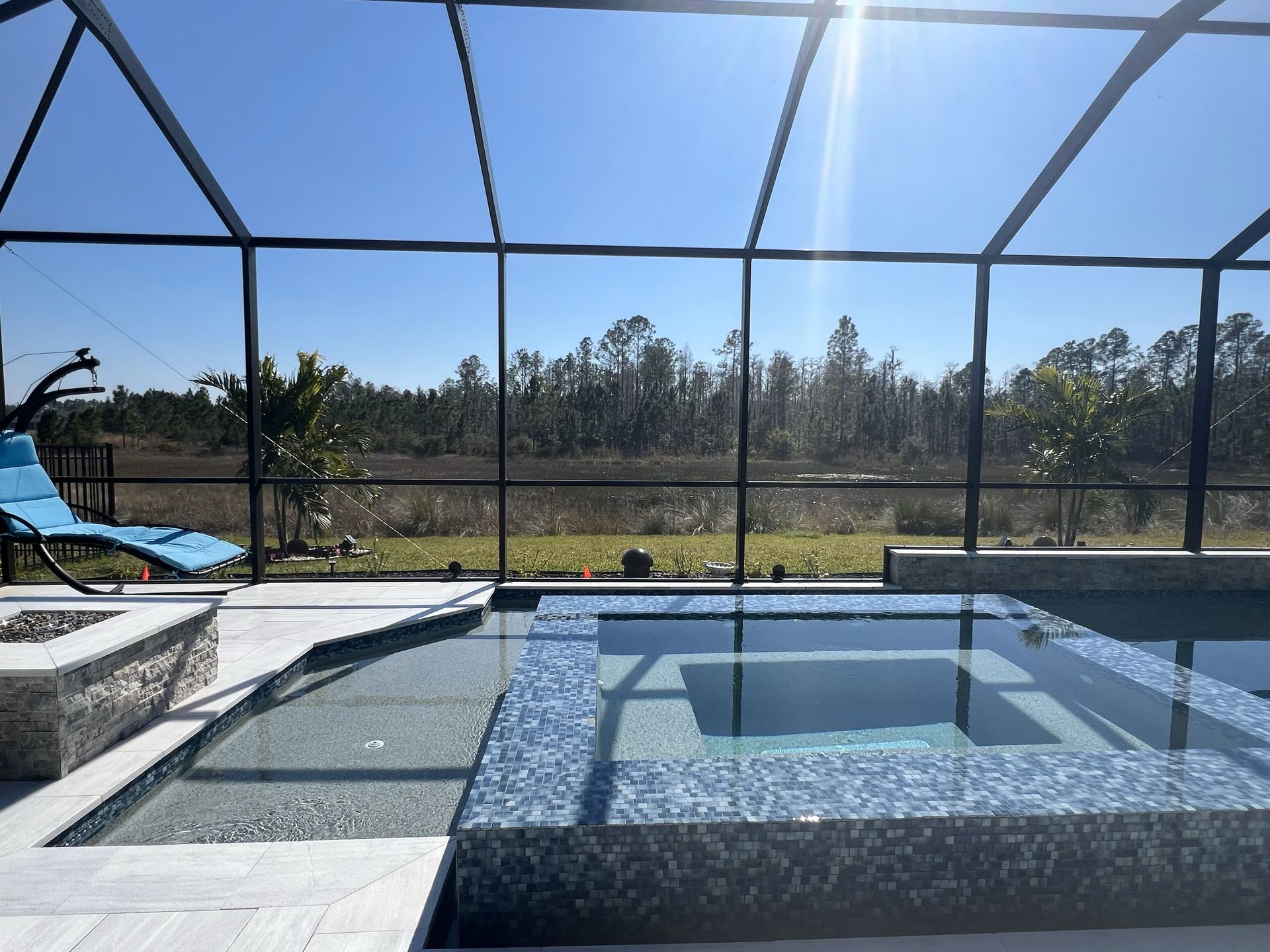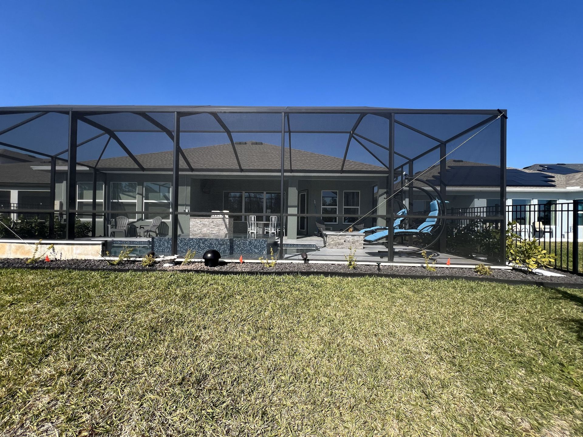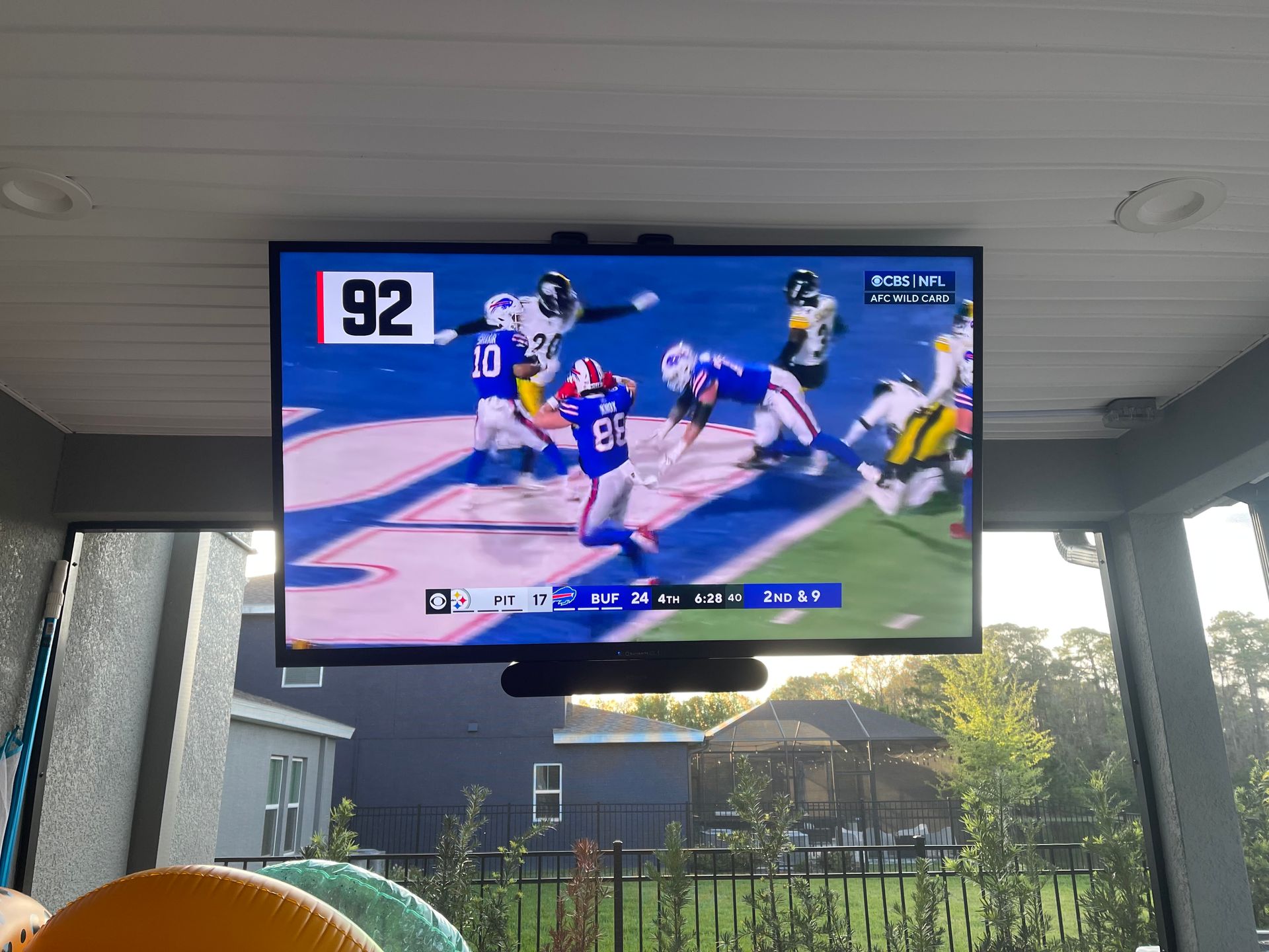 Lanai: Sunbrite outdoor TV, motorized ceiling mount with full 90° swivel, Sonos soundbar