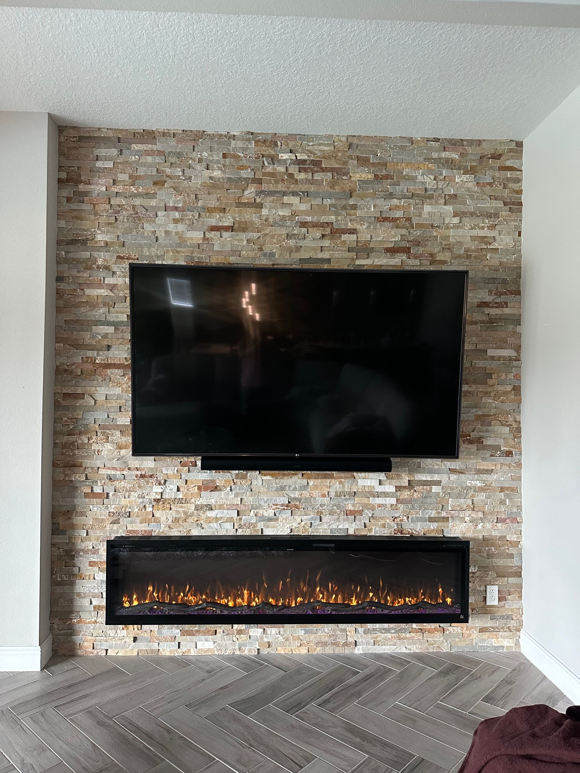 Living Room: Surface mounted electric fireplace, LG 4K TV and Sonos surround sound